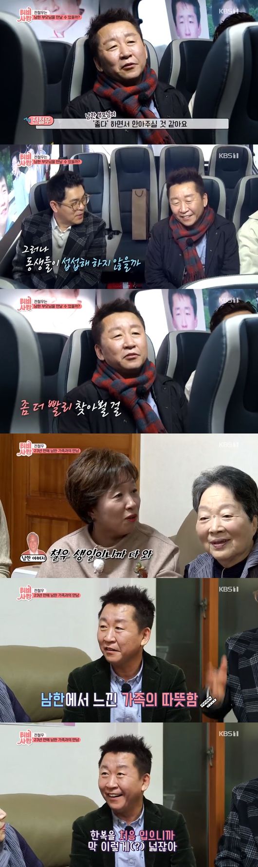 전철우는 "북에 있는 부모님 돌아가실 때도 못 뵀는데 아버님도 못 뵈니까 나에게 왜 이런 일이 일어나나라는 생각을 했다"라며 "그래도 어머니가 이렇게 건강하시니 기분이 좋다"라고 소감을 이야기했다.