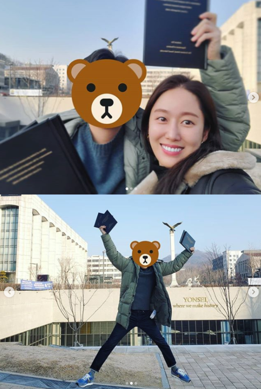 함께 올린 사진에서 전혜빈은 논문을 든 남편과 연세대학교에서 인증샷을 남기고 있다. 남편이 자랑스러운 듯 얼굴 가득 웃음꽃이 피었다. 그의 남편 역시 논문집을 들고 점프샷을 찍는 등 세상 기쁜 모습이다.