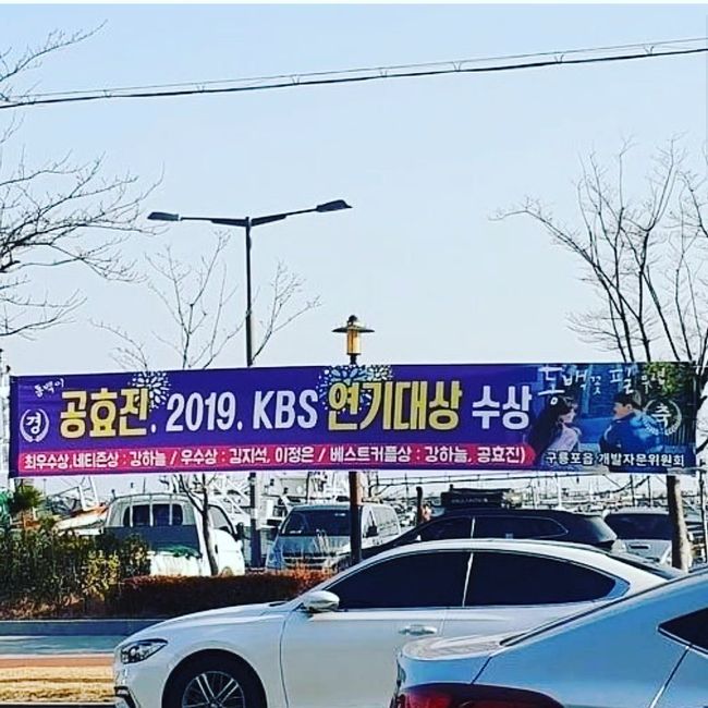 사진 속에는 ‘공효진, 2019 kBS 연기대상 수상’이라고 적힌 현수막이 담겼다. 이는 구룡포에서 ‘동백꽃 필 무렵’이 ‘2019 KBS 연기대상’에서 수상한 점을 축하하는 현수막으로, 공효진의 수상 외에도 강하늘, 김지석, 이정은 등 수상 내역이 적혀 있다.