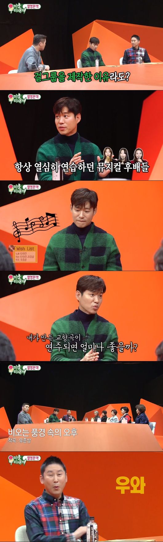 이에 신동엽은 "앨범 수록곡을 작사작곡 한 거냐"고 질문했다. 이에 유준상은 "멤버들에게 하고 싶은 말을 물은 다음 'wish list'란 곡을 만들었다"고 전했다. 이어 음악이 흘렀고 신동엽은 "오~ 좋은데"라며 놀라워했다.