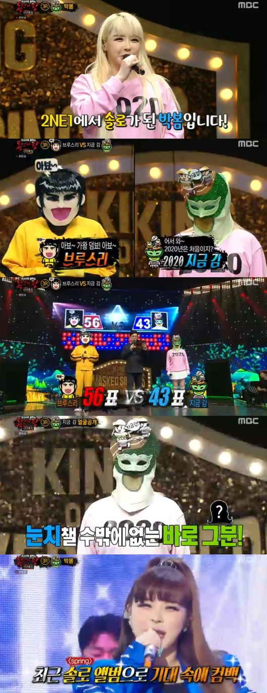 이로써 브루스리가 가왕전에 도전, 지금 감의 정체가 공개됐다. 그녀는 바로 2NE2 멤버에서 솔로로 돌아온 독보적인 음색 퀸 박봄이었다.