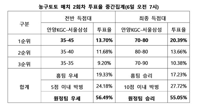 자세한 투표율을 살펴보면, 양팀의 10점 이내 박빙은 27.72%를 기록했고, 홈팀 안양KGC 승리 예상은 17.23%로 나타났다.