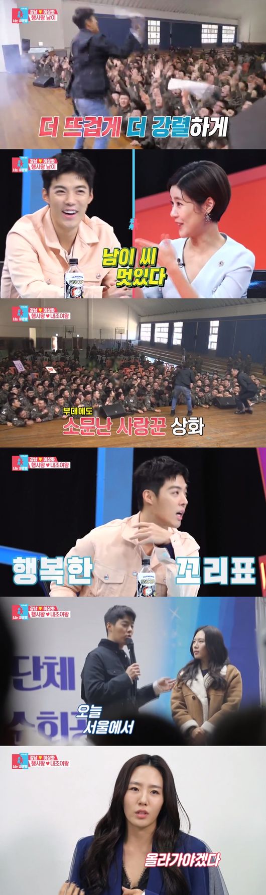 강남은 "오늘은 군부대 행사를 간다"라고 말했다. 이에 이상화는 "거기서 오빠를 불러주냐"라고 물었다. 강남은 "군대가 제일 잘 터진다"라고 말했다.