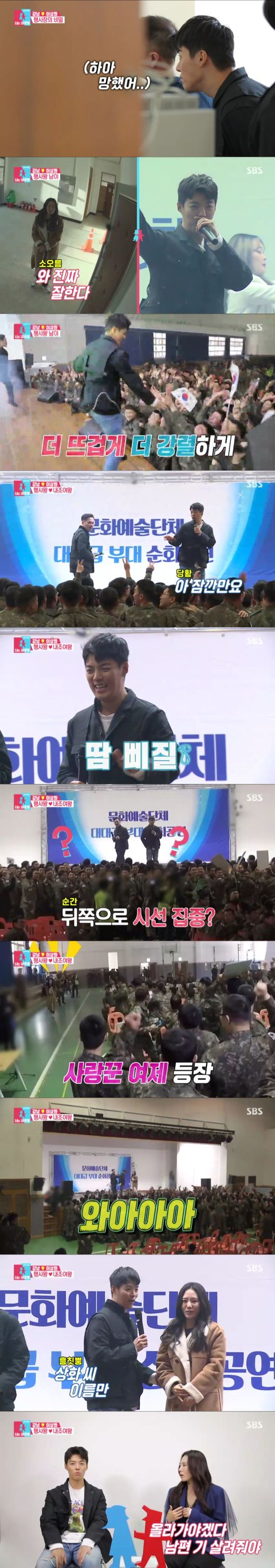 무대가 끝난 후 ‘앙코르’를 외치던 병사들은 ‘강남’ 대신 ‘이상화’의 이름을 외치기 시작했고, 이에 강남은 당황한 듯한 모습을 보였다. 그때 이상화가 무대 위로 깜짝 등장해 모두를 놀라게 했다. 이상화는 무대 뒤에서 안절부절하던 모습과는 달리 병사들에게 따뜻한 인사를 건넸다. 이후 인터뷰에서 이상화는 “올라가야겠다. 우리 남편 기 살려줘야겠다 생각해서 올라갔다”라고 해 뭉클함을 안겼다. 이날 이상화가 남편 강남에게 힘을 실어주기 위해 무대에 깜짝 등장한 이 장면은 분당 최고 시청률 10.8%로 ‘최고의 1분’을 차지하기도 했다.