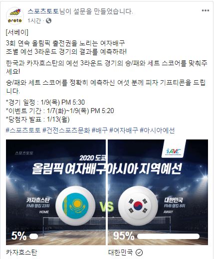 이번 이벤트의 대상경기는 오는 9일(목) 오후 5시30분에 펼쳐지는 2020 도쿄올림픽 여자배구 아시아지역 예선 3라운드 카자흐스탄(홈)-대한민국(원정)전이며, 최종 승패와 세트 스코어를 예측하는 방식으로 진행된다.