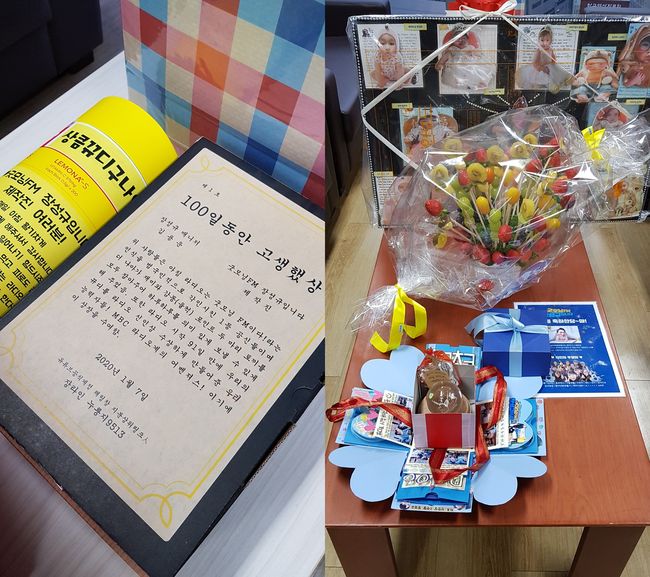장성규는 이날 팬들로부터 정성 가득한 도시락 및 간식 서포트는 물론 함께 고생해준 매니저와 라디오 제작진들에게만 수여하는 ‘100일동안 고생했상’을 전달받은 것.