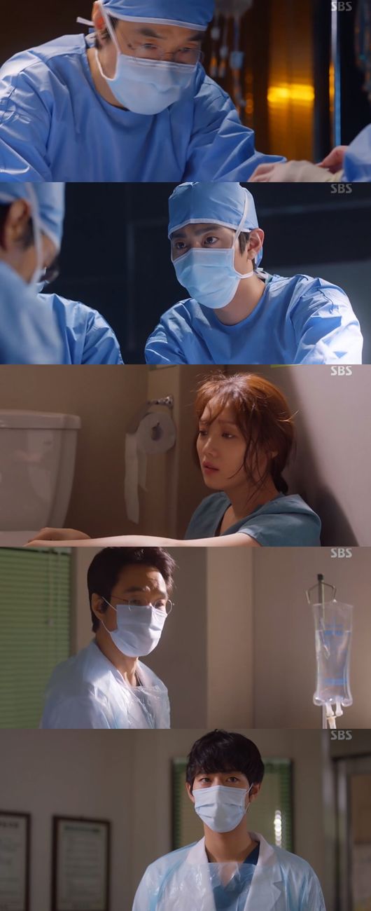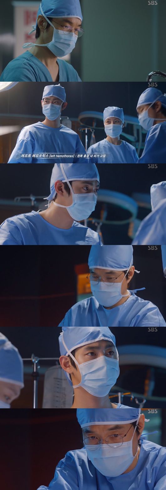 하지만 그때 차은재(이성경)의 수술 울렁증이 또 한 번 시작됐다. 차은재는 숨을 몰아 쉬며 "죄송하다"라고 말했다. 결국 김사부는 "서우진 나와라"라며 직접 출혈을 잡기 시작했다. 결국 차은재는 구토증상을 보이며 수술실을 뛰쳐 나갔다. 김사부의 수술을 지켜보던 서우진은 "이 사람 미쳤다"라고 깜짝 놀라는 모습을 보였다.