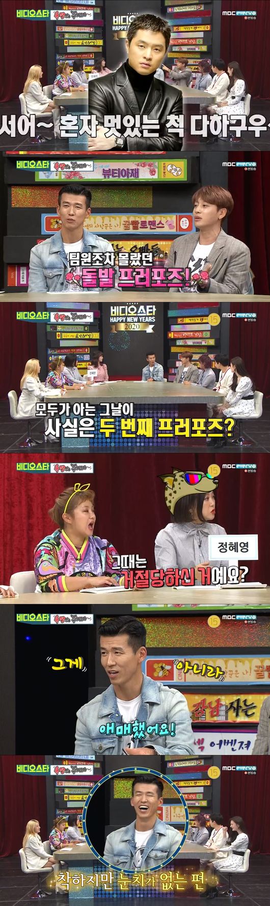 션은 "사실 그 전에 프러포즈를 한 적이 있다. 근데 대답이 애매했다. 좋은 것도 아니고 싫은 것도 아니었다"라고 말해 눈길을 끌었다. 이에 MC들은 "그게 거절이다. 눈치가 없다"라고 말해 주위를 웃음바다로 만들었다.