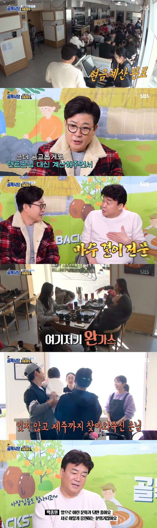 그때 백종원이 갑자기 자리에서 일어섰다. 백종원은 "텐트 테이블은 내가 계산을 하기로 했다. 약속을 지켜야 한다"라고 말했다. 백종원은 바로 가게로 내려가 시원하게 계산했다. 이 모습을 본 김성주는 "본의 아니게 백종원 대표님이 마수걸이를 하셨다"라고 말했다.