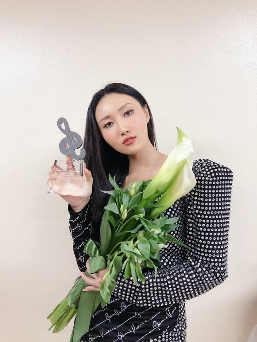 화사는 지난 8일 서울 잠실 실내체육관에서 열린 '제9회 가온차트 뮤직어워즈'에서 솔로 데뷔곡 '멍청이(twit)로 디지털 음원 부문 2월 올해의 가수상을 수상하며, 명실상부 솔로 아티스트로 우뚝 섰다.