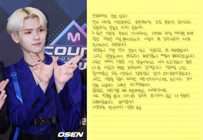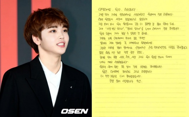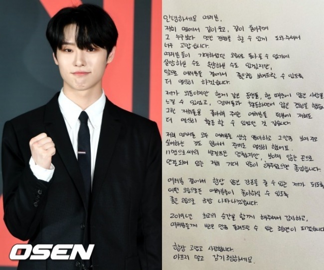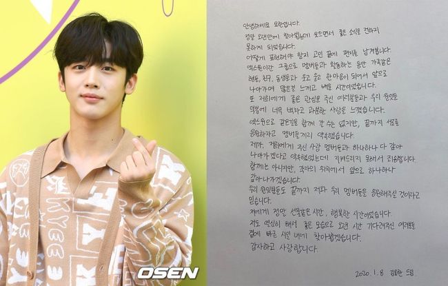 이어 김요한은 “주신 사랑 멤버들과 하나하나 다 갚아 나아가겠다고 약속했었는데 지키지 못해 죄송하다. 함께는 아니지만 각자의 위치에서 갚아 나가겠다”라며 “선물 같이 행복한 시간이었다. 열심히 해서 좋은 모습으로 여러분들 곁에 빠른 시일 내에 찾아뵙겠다”라며 다음을 기약했다.