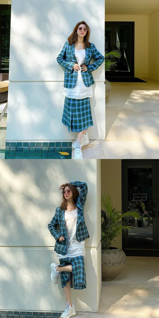 사진 속 윤세아는 블루, 그린 컬러가 체크패턴으로 이뤄진 재킷, 치마로 남다른 패션 센스를 뽐내고 있다. 레드빛의 선글라스와 레드립, 우월한 기럭지도 돋보인다.
