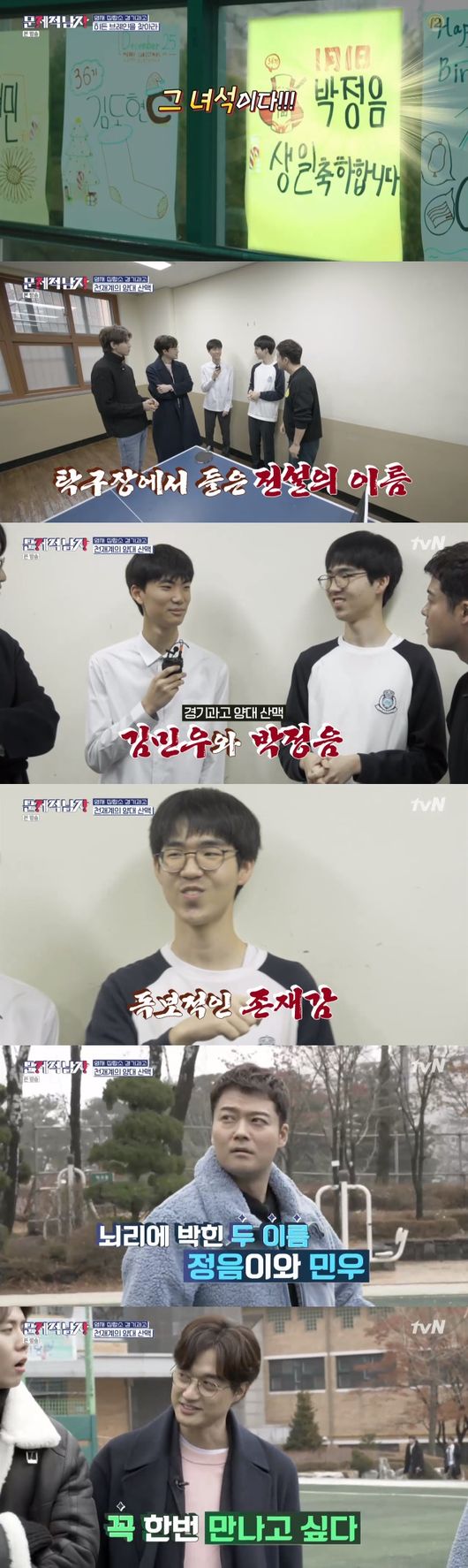 한편 현무팀은 농구를 하는 친구들에 이어 탁구를 하는 두 학생을 만났다. "우리가 이기면 경기과학고에서 제일 잘하는 친구들을 만나게 해달라"는 말에 친구들이 "저희가 이기면 사진을 찍어달라"고 했다. 이어 현무의 기습적인 공격이 시작되는 가운데, 학생들은 현무의 꼼수에도 승리를 이뤄내 함께 사진을 찍게 됐다. "근데 아까 우리가 이겼으면 알려주려고 했던 친구들이 누구였냐"는 현무의 물음에 친구들은 "전교 1등과 2등을 다투는 친구들이 있는데 김민우와 박정음이다. 머리가 워낙 좋아서 공부를 안해도 시험을 잘 본다"고 했다.