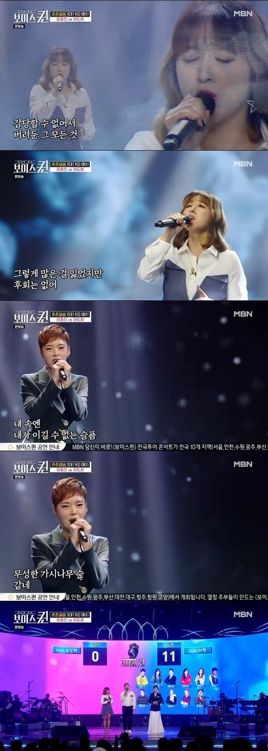 이어 이효진과 이도희가 무대에 등장했다. 이도희는 "최선을 다하는 게 서로를 향한 예의가 아닐까 싶다"고 얘기했다 이효진 역시 "힘든 상대다. 최선을 다하겠다"고 말했다. 이어 이효진의 무대가 펼쳐졌다. 이효진은 파워풀한 보이스로 임재범의 '비상'을 담담하고 안정적이게 불렀다.