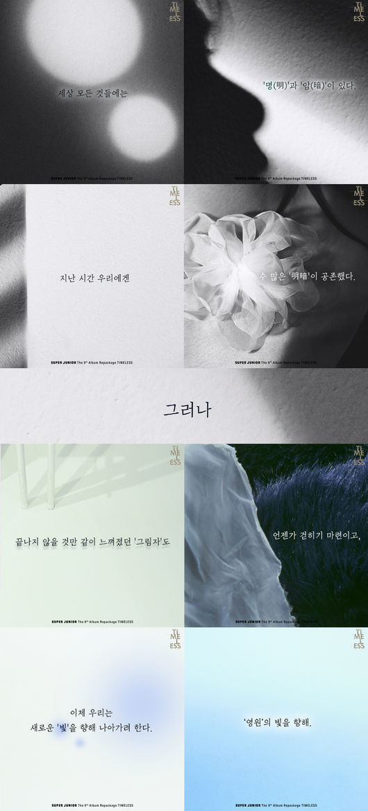 오늘(10일) 오전 10시 인스타그램, 페이스북, 웨이보 등 슈퍼주니어의 공식 SNS에는 ‘슈퍼주니어 정규 9집 리패키지 TIMELESS #Storytelling Cards’ 이미지가 업로드됐다. 공개된 카드는 “세상 모든 것들에는 ‘명(明)’과 ‘암(暗)’이 있다”는 의미심장한 문구로 시작해, “지난 시간 우리에겐 수 많은 ‘明暗’이 공존했다”며 슈퍼주니어의 지난 발자취를 돌아보게 했다.