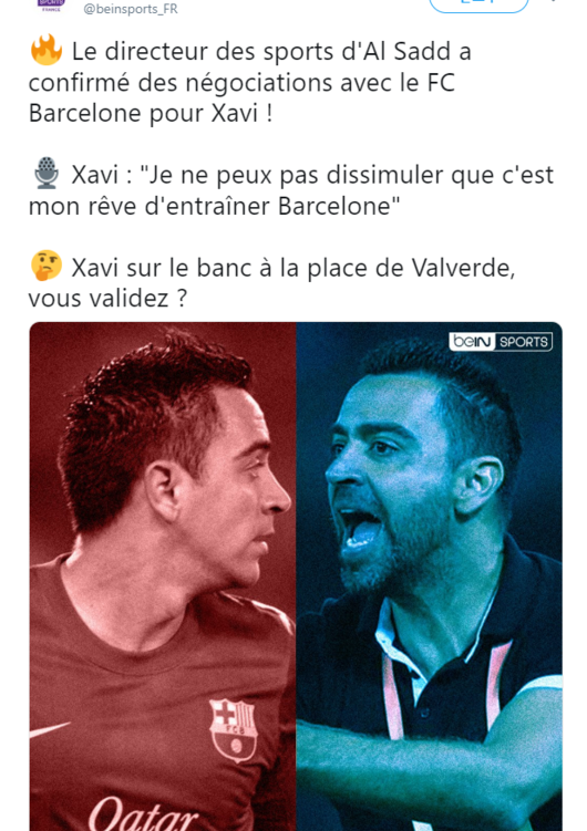 카타르 '베인 스포츠'는 12일(한국시간) "알 사드의 스포츠 디렉터는 사비의 거취를 두고 FC 바르셀로나와 협상을 완료했다고 밝혔다"고 보도했다.