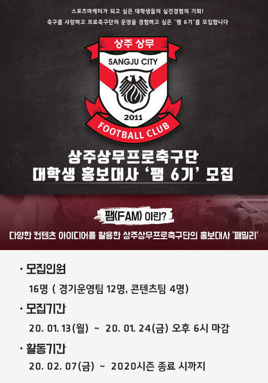 상주상무프로축구단이 2020시즌을 함께 만들어갈 대학생 마케터 팸 6기를 모집한다.