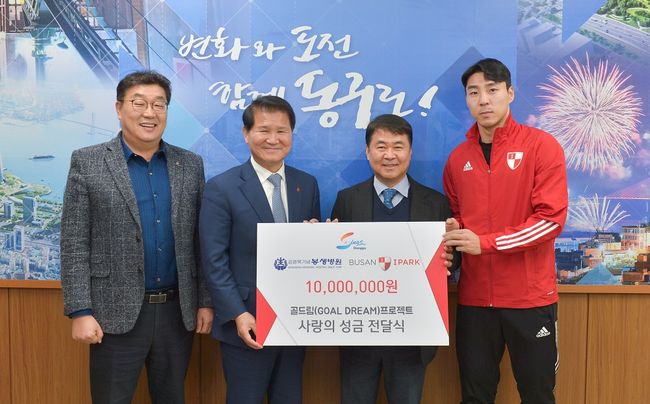 부산아이파크는 지난 1월 13일(월) 오전 부산광역시 동구청에서 최형욱 부산동구청장, 전재훈 김원묵기념 봉생병원 총괄이사, 남성학 부산광역시 동구체육회 사무국장, 부산아이파크 이정협 선수 등이 참여한 가운데 골드림 프로젝트로 모은 사랑의 성금 전달식을 가졌다.
