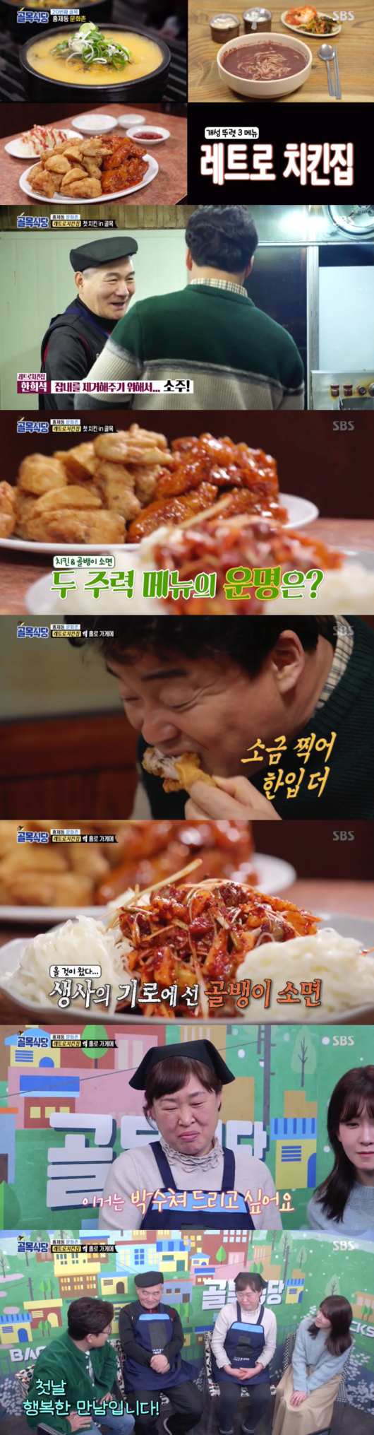 백종원은 양념 반 후라이드 반과 골뱅이 소면을 시켰다. 메뉴판을 보더니 20가지 메뉴가 넘는다며 “두 분의 평화를 위해 메뉴를 반으로 줄여드려야겠다”고 다짐했다. 남자 사장은 “기계도 인수 받을 때 그대로다. 잡내 제거하기 위해 기름에 소주 넣었다. 그래서 시끄럽다. 인수 받을 때부터 일러준 대로 만들고 있다”고 알렸다.
