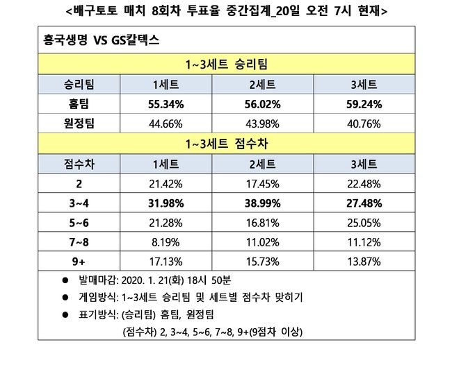 1~3세트 승리팀과 점수차를 맞히는 배구토토 매치 8회차 게임에서 1~3 세트별 예상 승리팀은 모두 홈팀인 흥국생명의 차지로 돌아갔다.