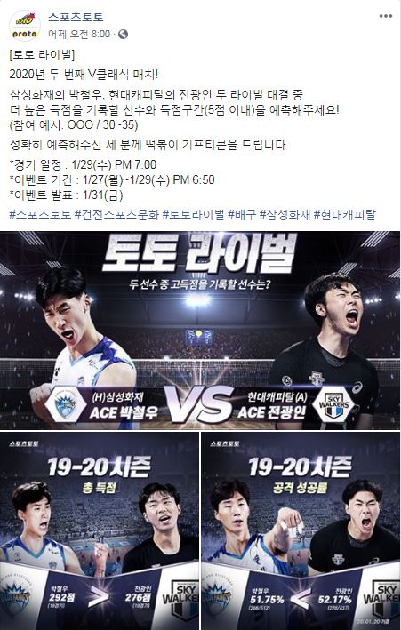 이번 이벤트는 29일(수) 오후 7시에 벌어지는 2019-20 V리그 삼성화재-현대캐피탈전에 출전하는 박철우와 전광인의 득점구간을 맞히는 방식으로 진행된다.