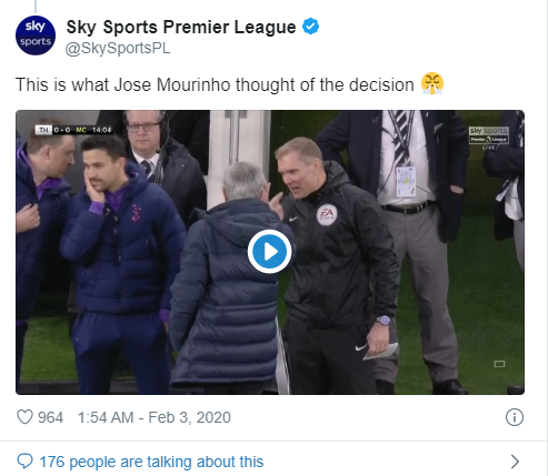 지난 3일 열린 2019-2020 잉글랜드 프리미어리그(EPL) 25라운드 토트넘-맨시티전서 무리뉴 감독은 심판 판정에 대한 격한 반응으로 화제를 모았다.