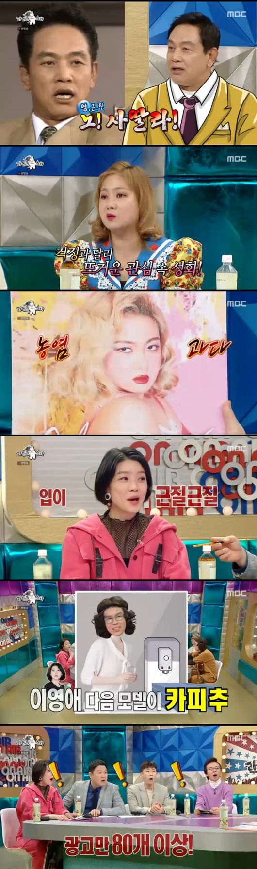 박나래 역시 화장품 광고 제안을 받았다면서 "코에 있는 피지역을 맡았다"고 말해 폭소하게 했다. 박나래는 "맥주광고도 들어와, 맥주 한 잔을 안 마시고 전세계 사람들 다 분장했던 광고"라면서 "15시간 동안 20개국 분장했다"고 말했다. 또한 여행 광고에서 모델 조인성과 광고가 들어와 설렜다는 박나래는 "알고보니 조인성 분장이더라"면서 하고 싶은 광고에 대해선 "예능인이 안 할 것 같은 향수 모델 하고 싶다"고 전했다.