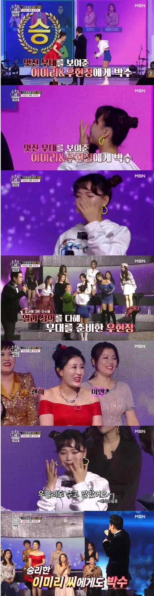 자신이 있냐는 용만의 질문에 이미리가 "자신있다고 하면 나빠 보일 거 같다"면서 말을 아꼈고, 우현정은 "미리 언니의 첫 소절을 듣고 이길 꺼라는 생각을 버렸다"고 했다. 천진한 그녀의 웃음에 트로트팀의 응원이 이어졌다. 하지만 첫 득점은 우현정이 가져갔다. 현정이 기대하지 않았던 득점에 눈물을 흘리면서 감동하고 있는 가운데. 나머지 득점 4개를 미리가 가져가면서 미리의 승리가 확정 됐다. 정말 열과 성을 다했기 때문에 눈물을 흘리는 거 같다는 용만의 말에 이미리가 미안한 표정을 지었다.