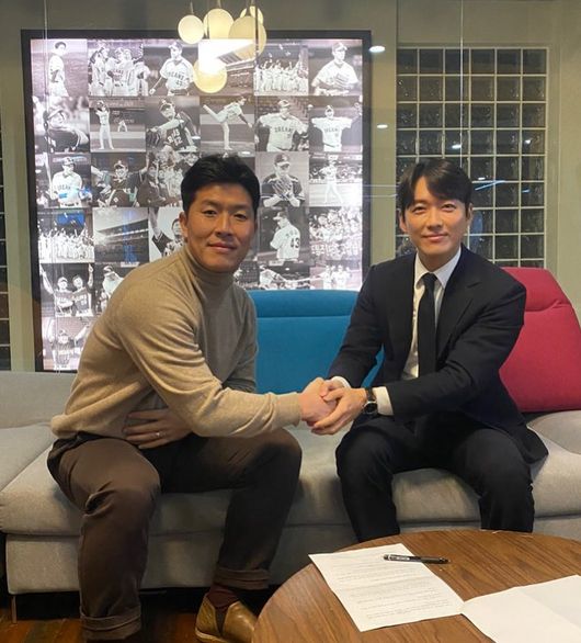 사진 속에서 김병현과 남궁민은 SBS 금토드라마 ‘스토브리그’ 촬영 현장에서 악수를 하고 있는 모습이다. 마치 백승수 단장과 메이저리그에서 활약했던 김병현이 계약하는 듯한 모습이 흥미를 자아낸다.