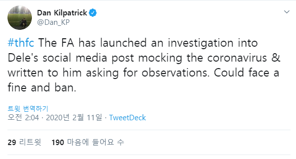 영국 '이브닝 스탠다드'의 댄 킬패트릭 기자는 11일(한국시간) 자신의 SNS를 통해 "잉글랜드 축구 협회(FA)가 코로나 바이러스를 조롱한 델레 알리에 대한 조사에 착수했다"라고 전했다.