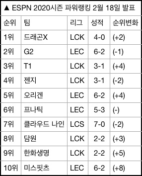 ESPN은 18일 오전(이하 한국시간) 2020년 스프링 스플릿 3번째 LOL e스포츠 프로팀 파워 랭킹을 공개했다. 이번 랭킹에는 많은 순위 변동이 있었다. ‘LOL 유로피안 챔피언십(이하 LEC)’의 최강팀 G2가 2연패에 빠지며 2위로 미끄러진 가운데 드래곤X, T1이 각각 1, 3위로 약진에 성공했다.
