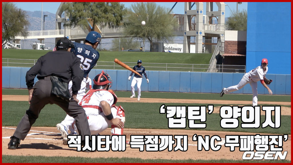 27일(한국시간) 미국 애리조나 투산 키노 스포츠콤플렉스에서 SK 와이번스와 NC 다이노스의 연습경기가 열렸다. NC ‘캡틴’ 양의지가 1사 만루 찬스에서 2타점 중전 적시타를 날리고, 계속된 1사 1,2루에서 김성욱의 우중간을 가르는 2타점 2루타에 득점에 성공했다.