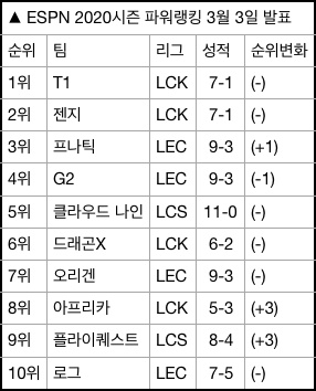ESPN은 3일 오전(이하 한국시간) 2020년 스프링 스플릿 5번째 LOL e스포츠 프로팀 파워랭킹을 공개했다. 이번 랭킹은 큰 변화가 없었다. 2020 LCK 스프링 스플릿에서 공동 1위를 기록하고 있는 T1, 젠지가 나란히 1, 2위를 유지한 가운데 ‘LOL 유로피안 챔피언십(이하 LEC)’의 강팀 프나틱, G2가 뒤를 쫓았다.