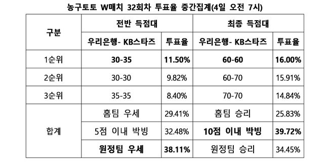 WKBL 우리은행-KB스타즈전 대상 농구토토 W매치 32회차 투표율 중간집계