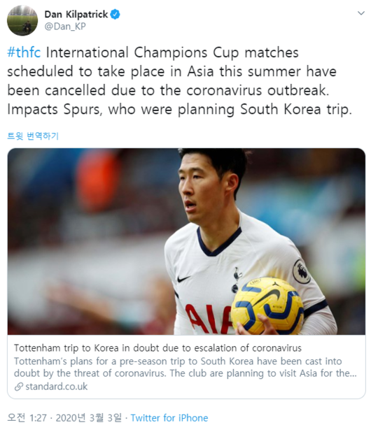 그러나 ICC컵이 코로나로 인해 취소되며 토트넘의 방한 역시 무산될 확률이 높다. 이브닝 스탠다드는 "7월 말로 예정됐떤 토트넘의 프리 시즌 투어는 영국 정부의 한국 여행 자제 경고로 인해 취소될 확률이 높다"고 전했다.
