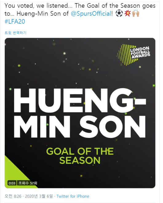 손흥민은 6일(한국시간) 영국 런던 캠던 라운드하우스에서 열린 제 6회 영국 런던풋볼어워즈(LFA)서 올해의 골의 영광을 안았다.