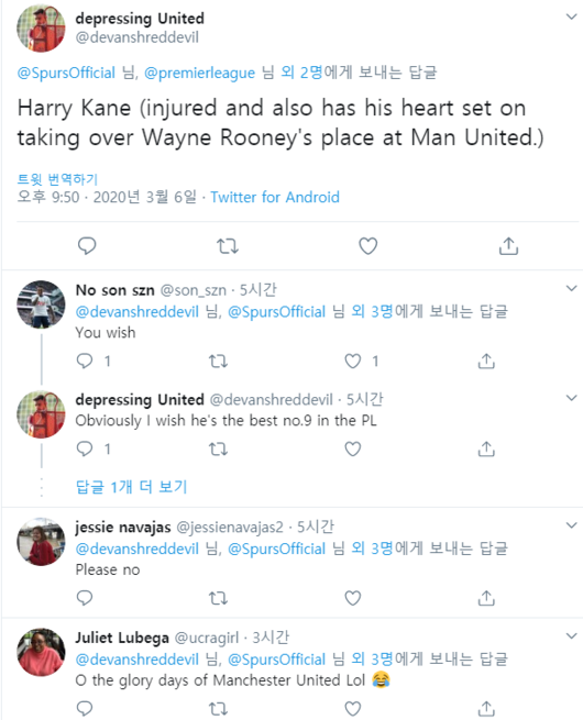 재미있게도 토트넘 공식 SNS에 맨체스터 유나이티드 팬이 대거 출동해서 화제를 모았다. 앞서 영국 언론에서는 케인이 토트넘서 리빌딩을 하기 보다는 다른 팀 이적을 원한다고 이적 루머를 전했다.