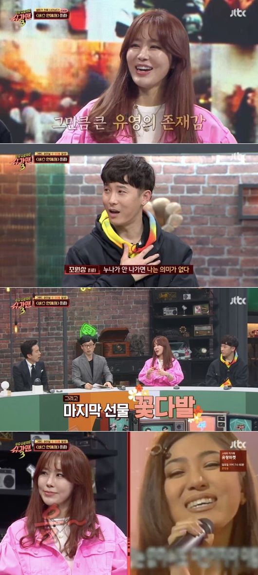 6일 밤 방송된 JTBC 예능 프로그램 '투유 프로젝트-슈가맨 시즌3(이하 슈가맨3)' 14회(마지막 회)에서는 자전거 탄 풍경(이하 자탄풍)과 자자가 각각 유희열, 유재석 팀의 슈가맨으로 등장했다. 마지막을 달구기에 충분한 '쌍100불' 라인업이었다.