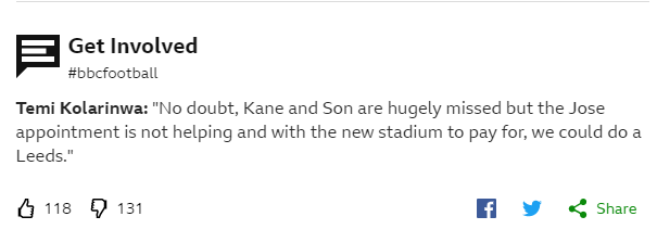 번리전 직후 무리뉴 감독에 대한 불만은 더욱 커진 것으로 보인다. 영국 'BBC'의 시청자 참여 코너 'Get Involved'에서도 토트넘 팬들의 차가운 반응을 알 수 있었다.