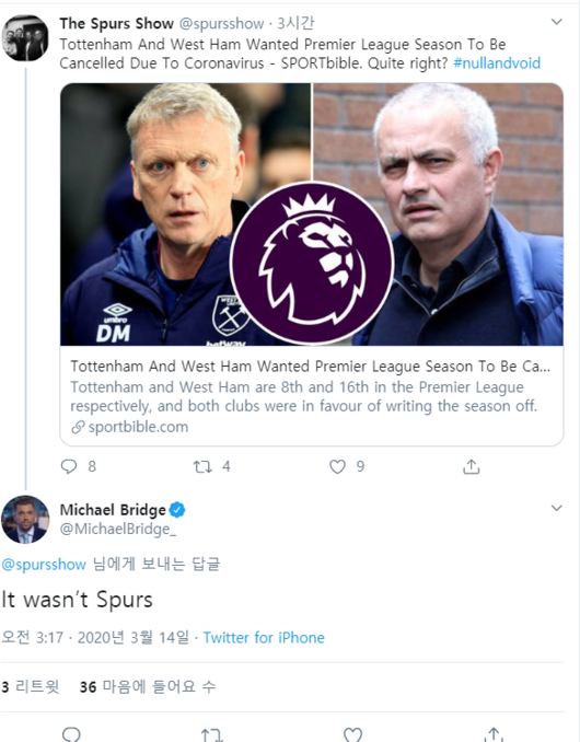 이런 논란들에 대해 브리지 기자는 한 팬이 자신에게 EPL 긴급 회의서 무효를 주장한 구단이 어디냐고 묻자 "토트넘은 아니다"라고 설명했다.