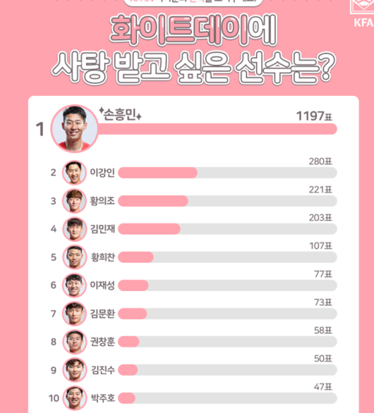 KFA는 지난 3일부터 10일까지 KFAN 회원들을 대상으로 국가 대표팀 선수 중에서 '화이트데이날 사탕을 받고 싶은 선수'에 대한 투표를 진행했다.