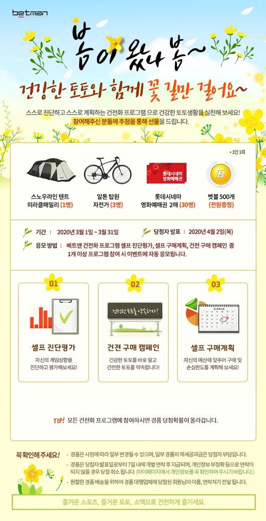 체육진흥투표권 스포츠토토의 공식온라인 발매사이트인 베트맨(www.betman.co.kr)이 2020년 3월 건전화 프로그램 이벤트인 ‘봄이 왔나 봄~ 건강한 토토와 함께 꽃길만 걸어요’가 조회수 1만건을 돌파하며 인기몰이를 하고 있다.