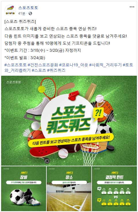 국민체육진흥공단이 발행하는 체육진흥투표권 스포츠토토의 수탁사업자인 ㈜케이토토가 공식 페이스북을 통해 오는 20일(금) 자정까지 힌트를 보고 연상되는 스포츠 종목을 맞히는 ‘스포츠 종목 연상 퀴즈’ 이벤트를 실시한다고 밝혔다.