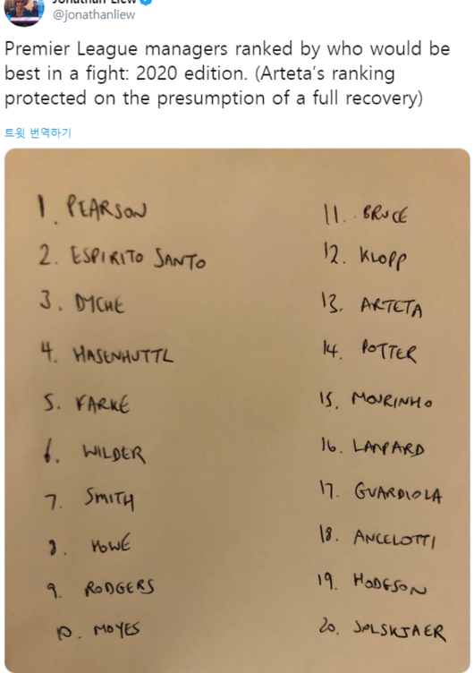 리우의 리스트에서 미켈 아르테타 아스날 감독이 전투력 13위에 올랐다. 단 리우는 "아르테타 감독이 코로나 바이러스에서 완전히 회복됐을 경우"라고 전제 조건을 달았다.