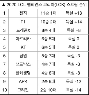 T1은 29일 오후 온라인으로 열린 ‘2020 LOL 챔피언스 코리아(이하 LCK)’ 스프링 스플릿 2라운드 한화생명전서 2-1로 승리했다. 이 승리로 3연승을 달성한 T1은 10승(2패, 득실 +14) 고지에 2번째로 등반하며 1위 젠지를 바짝 쫓았다. 시즌 8패(4승, 득실 -8)째를 당한 한화생명은 중위권 경쟁에서 더욱 멀어졌다.