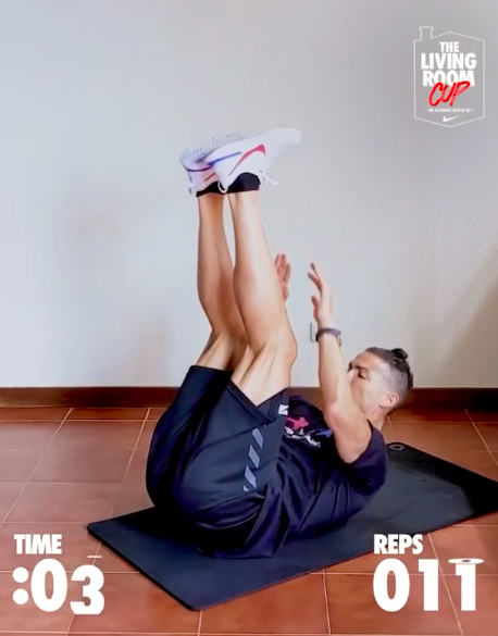 리빙룸컵이란 요가매트에 누운 자세로 다리를 들어올려 발목을 터치하는 복근운동을 1분 동안 얼마나 많이 하느냐를 겨루는 종목이다. 직접 시범에 나선 호날두는 1분간 무려 142회를 기록했다.
