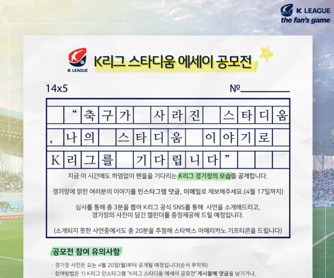 한창 선수와 팬들로 북적거려야할 4월의 K리그는 코로나19의 여파로 팬과의 만남을 잠시 뒤로 미룬 상태다. 이에 연맹은 K리그를 그리고 K리그 경기장을 그리워하는 팬들을 대상으로 “K리그 스타디움 에세이” 이벤트를 기획했다.