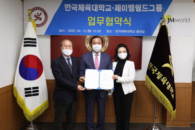 한국체육대학교는 13일 서울시 송파구에 있는 한국체대 총장 부속실에서 ㈜JM월드그룹-JM지저스, ㈜대월에너지와 업무협약을 체결했다. 주요 협력 사항은 △관련 분야 인재양성 △관련 사업 분야 육성과 관계되는 교육 및 시설지원 △연구 및 기술지원 등이다.
