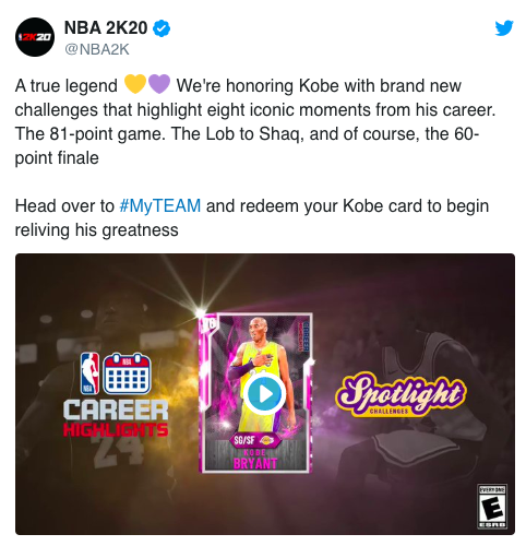 2K스포츠는 “우리는 진정한 레전드 코비를 추모하며 새로운 챌린지를 출시했다. 한 경기 81점, 샤킬 오닐에게 준 패스, 마지막 경기 60점 등 대표적인 장면을 담았다. 마이팀에서 코비 카드를 뽑아보길 바란다"고 당부했다. / jasonseo34@osen.co.kr