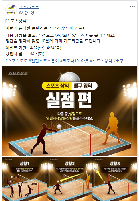 국민체육진흥공단이 발행하는 체육진흥투표권 스포츠토토의 수탁사업자인 ㈜케이토토가 공식 페이스북을 통해 오는 24일(금) 자정까지 배구 실점과 관련된 퀴즈를 맞히는 ‘스포츠상식 배구 영역’ 이벤트를 실시한다고 밝혔다.